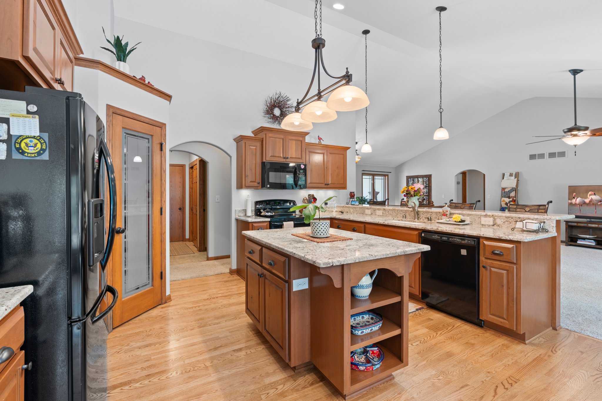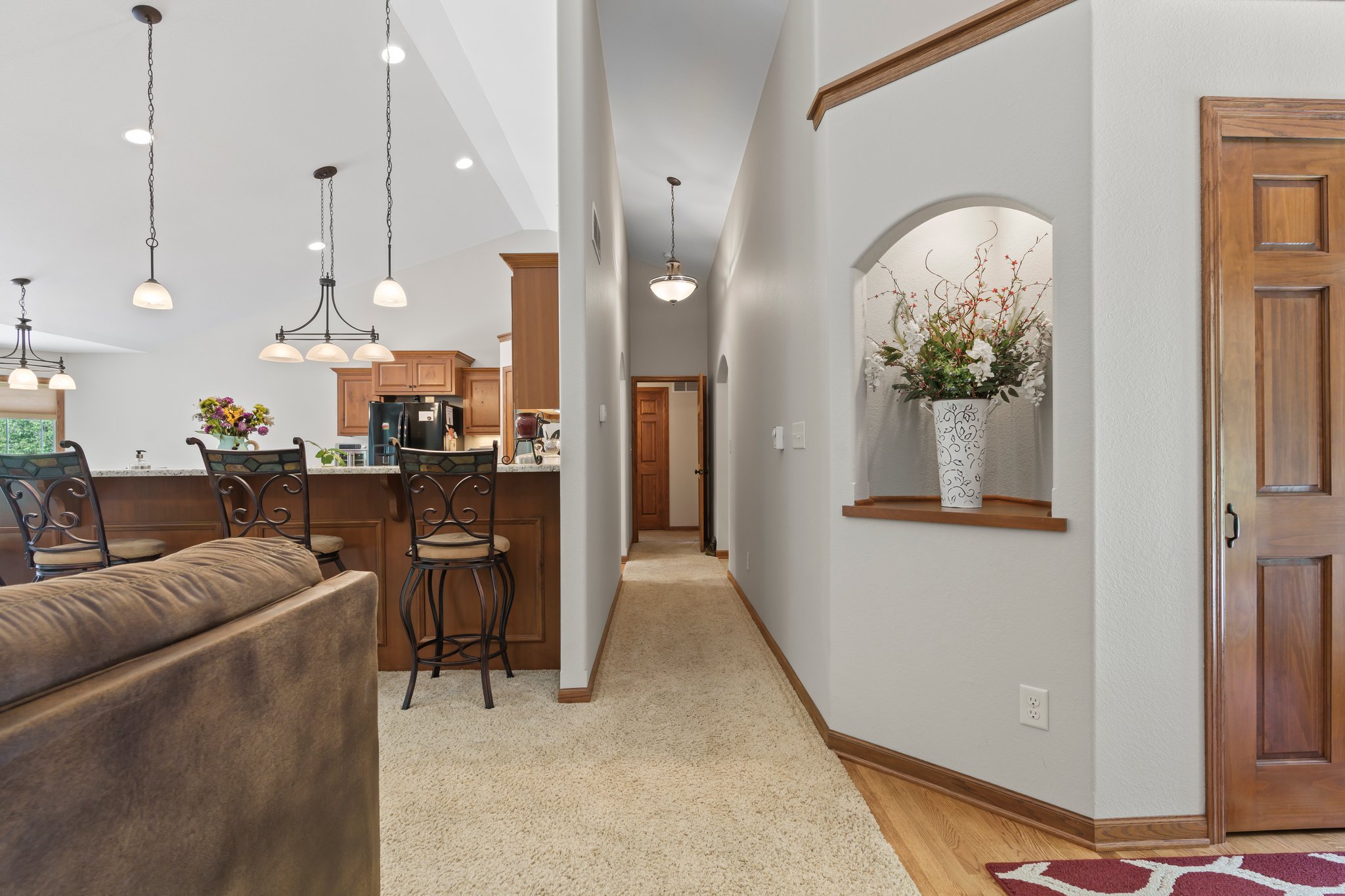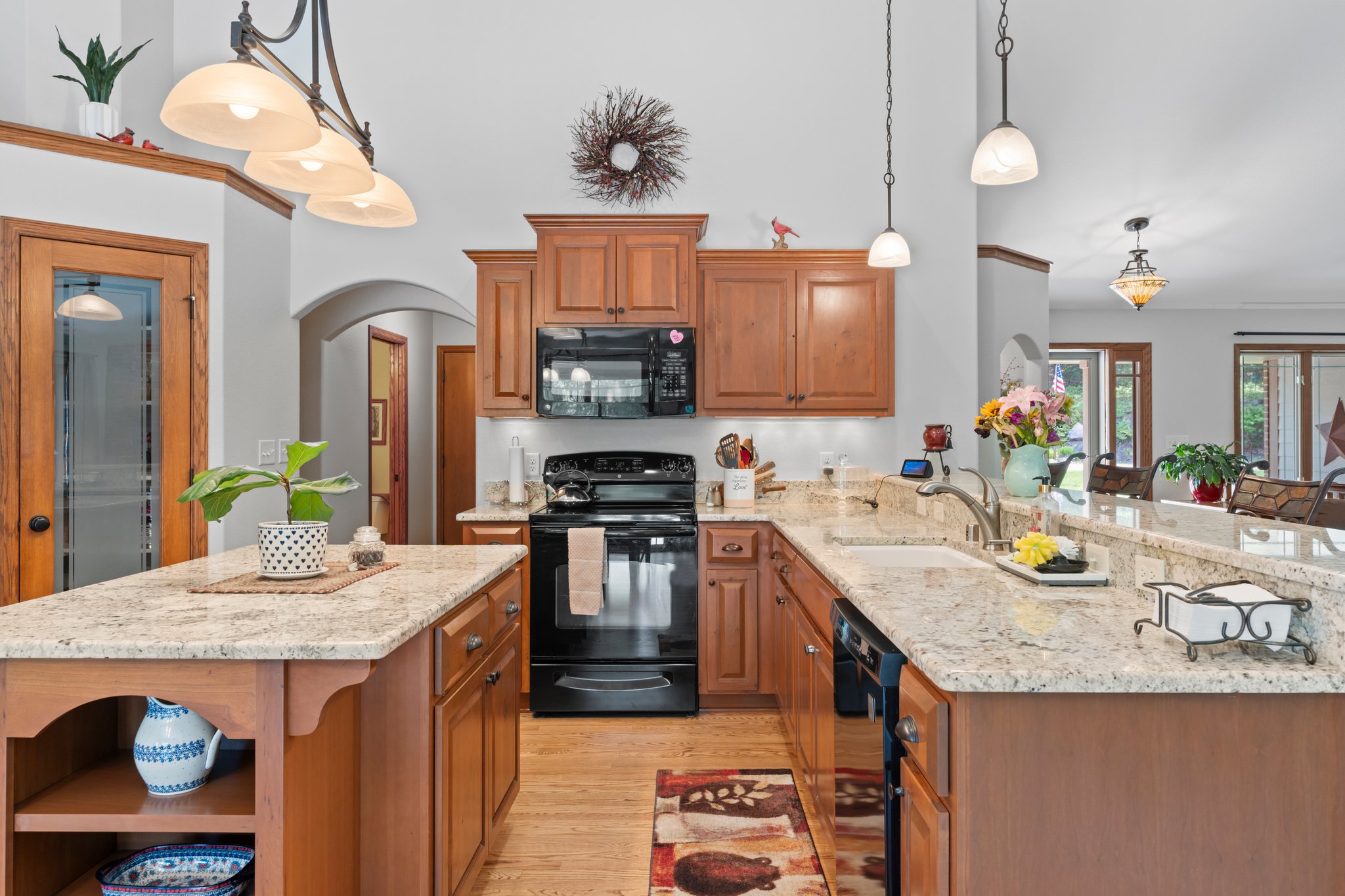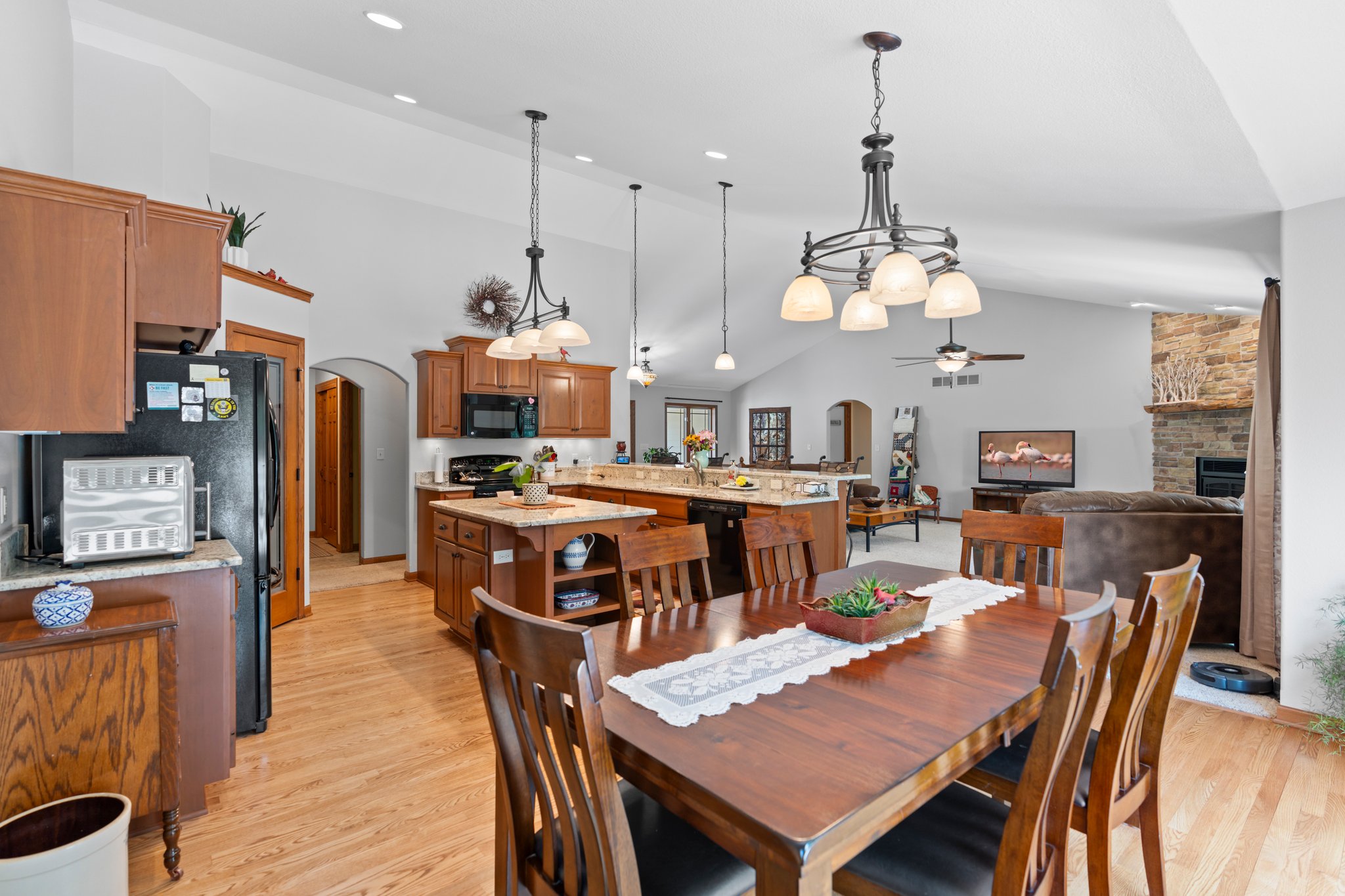 Step inside the custom-built 4-bedroom, 3.5-bath residence and you’re greeted by a wide foyer that effortlessly flows into the great room. Vaulted ceilings, hardwood floors, a wood-burning stone fireplace, and natural light from expansive windows and patio doors set a warm, inviting tone. Graceful arched doorways and rounded bullnose corners create rich architectural detail while accentuating the open flow.
