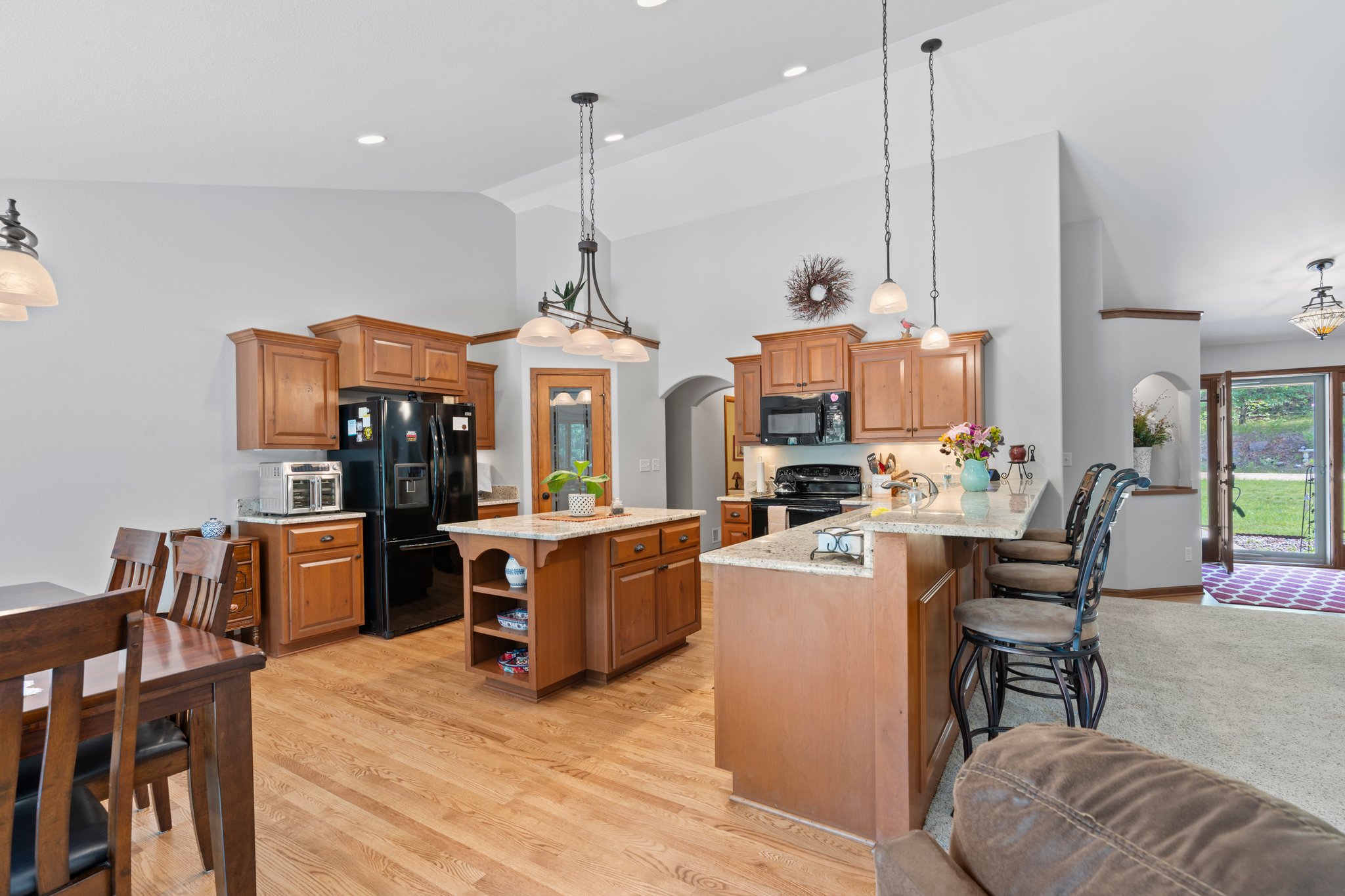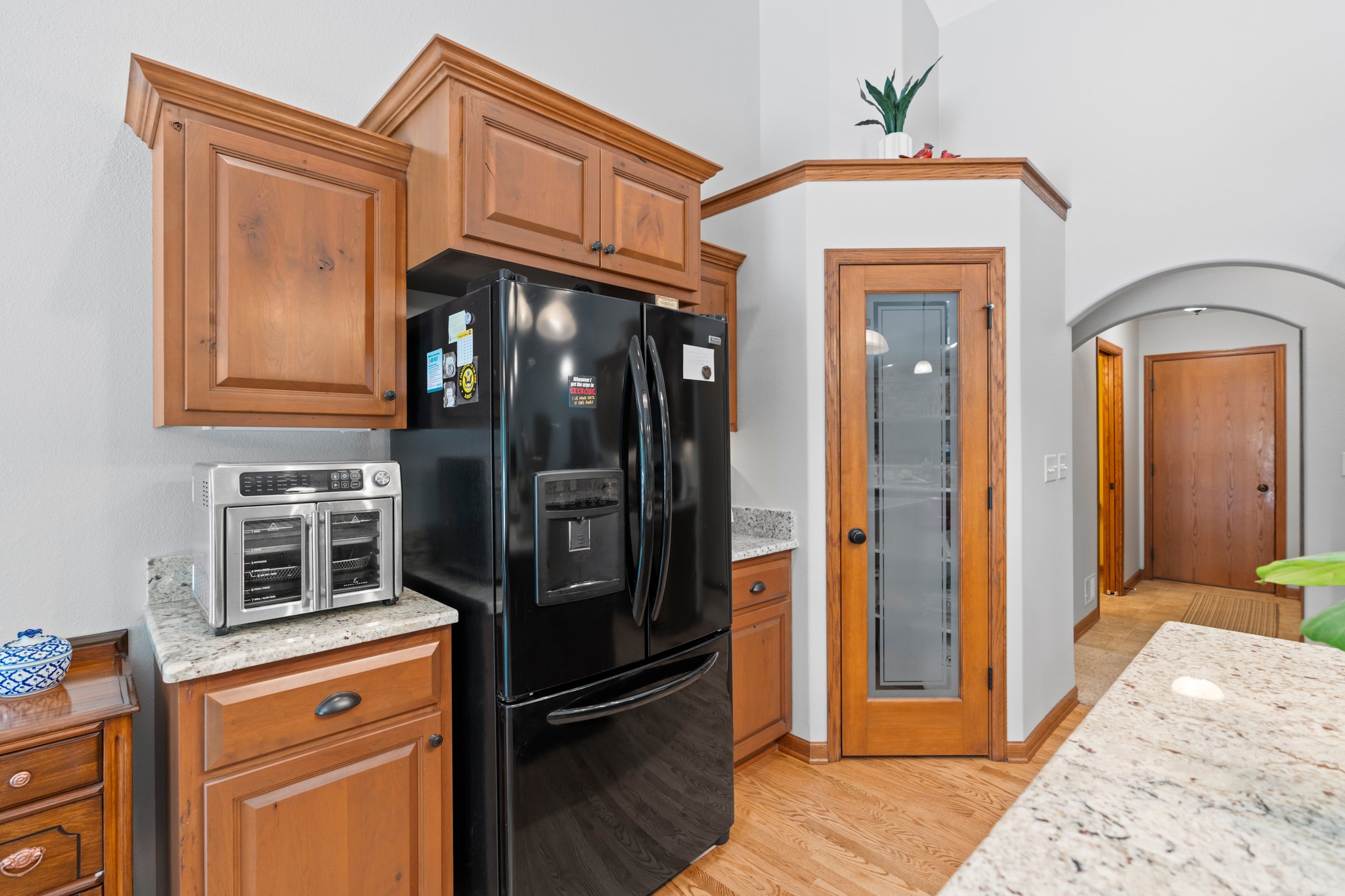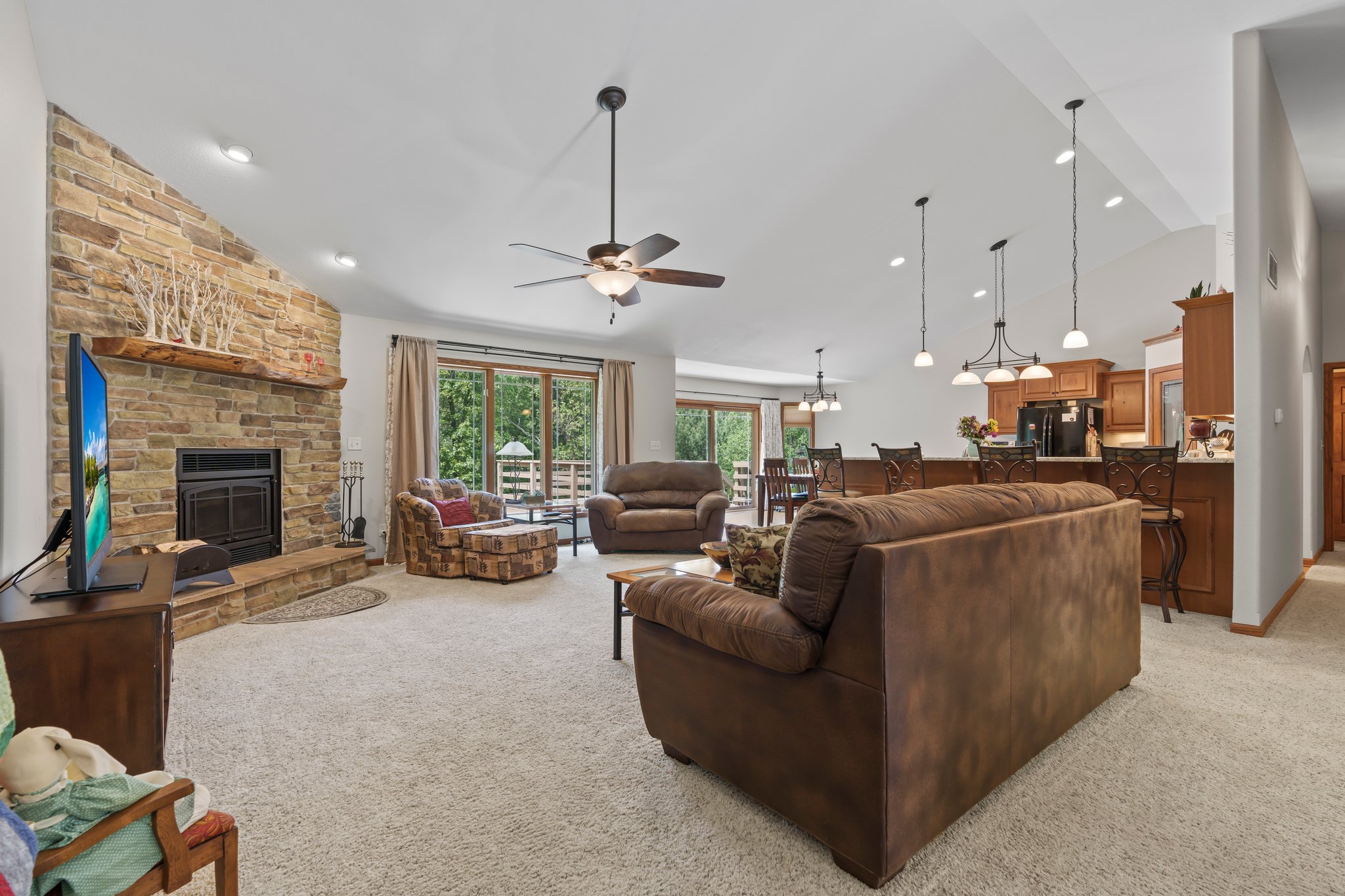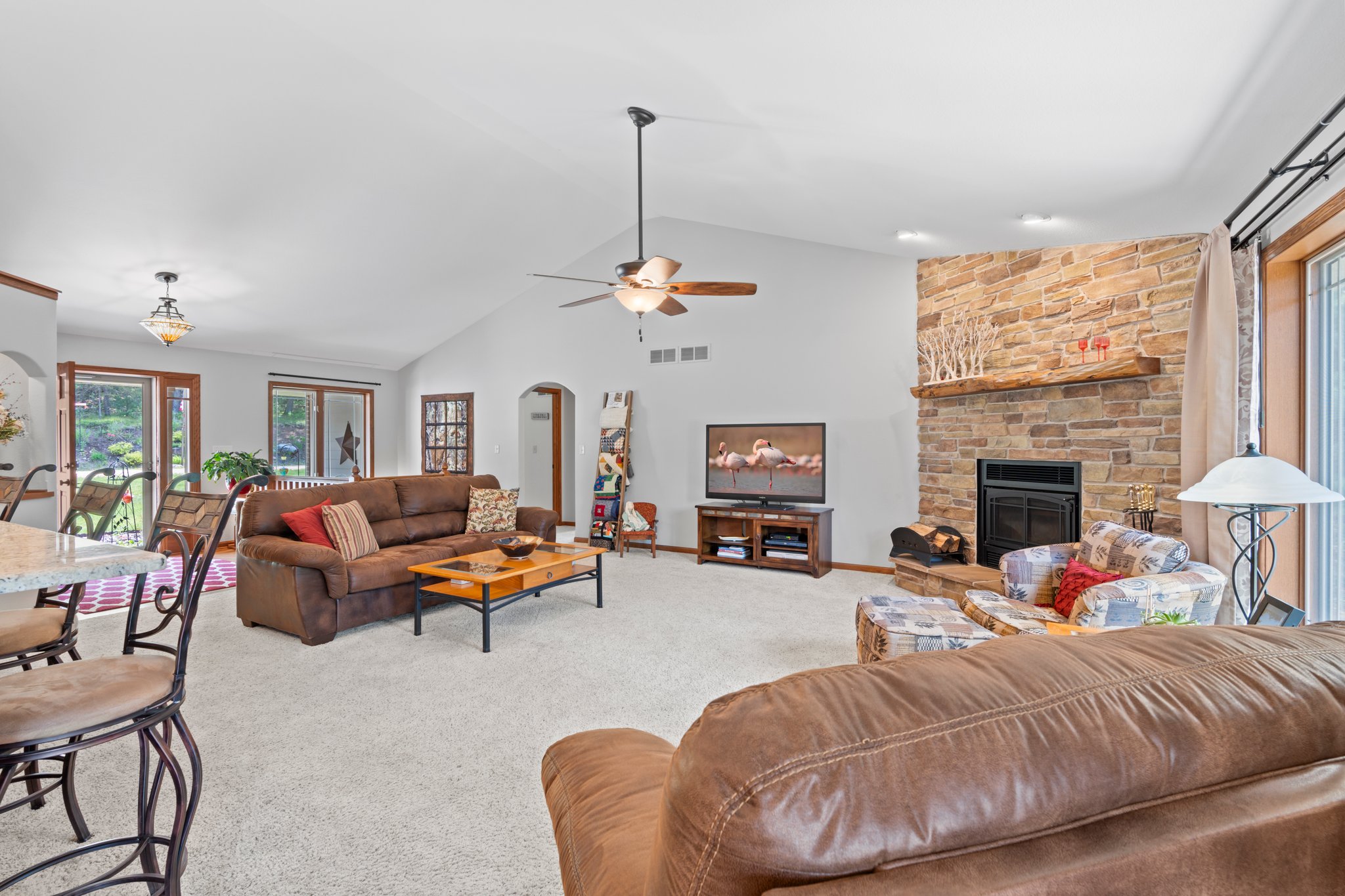 Step inside the custom-built 4-bedroom, 3.5-bath residence and you’re greeted by a wide foyer that effortlessly flows into the great room. Vaulted ceilings, hardwood floors, a wood-burning stone fireplace, and natural light from expansive windows and patio doors set a warm, inviting tone. Graceful arched doorways and rounded bullnose corners create rich architectural detail while accentuating the open flow.