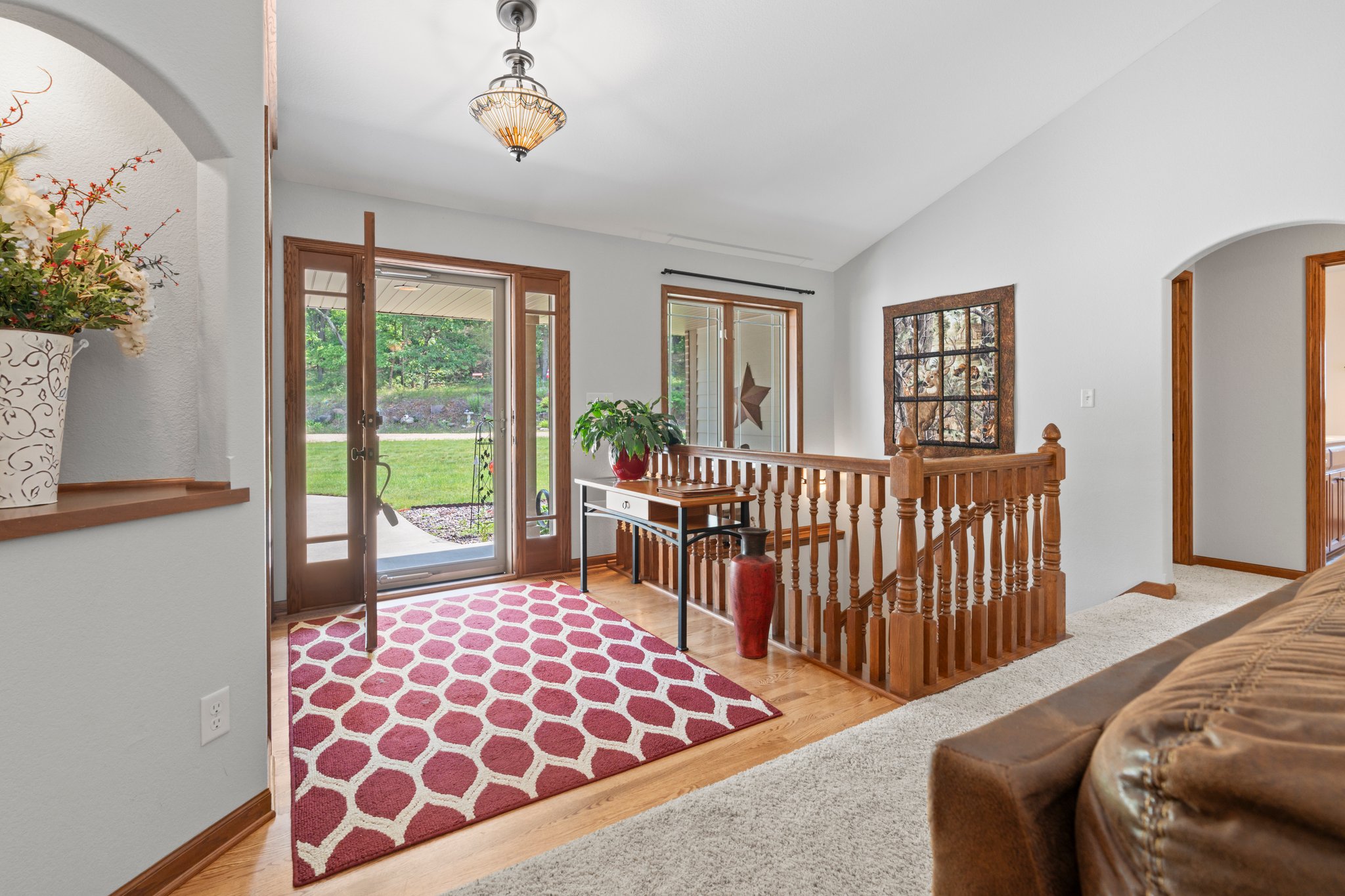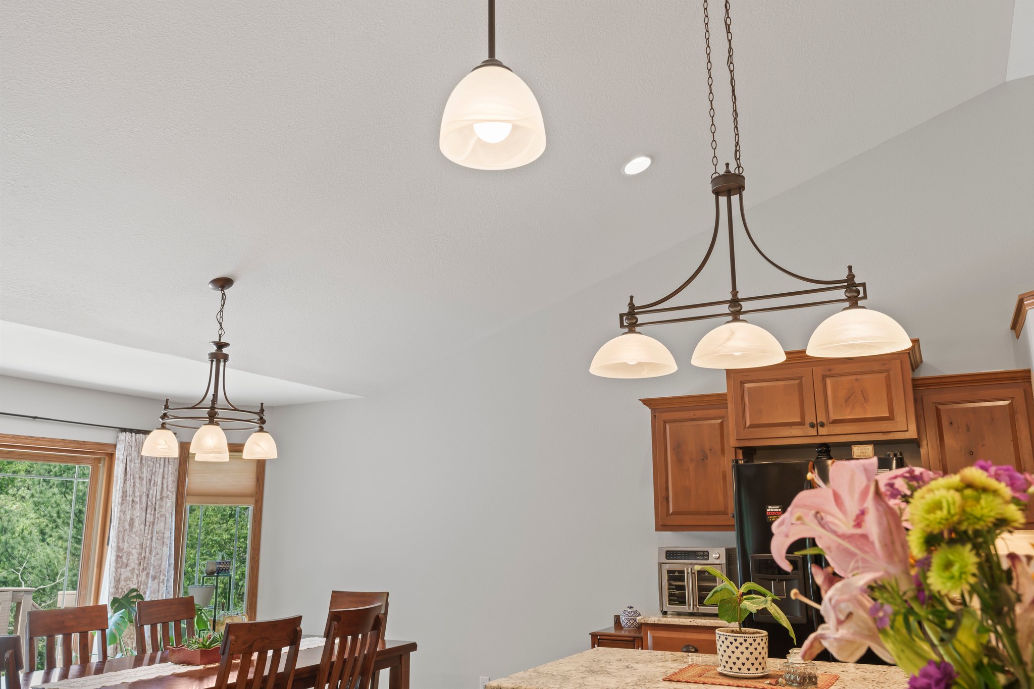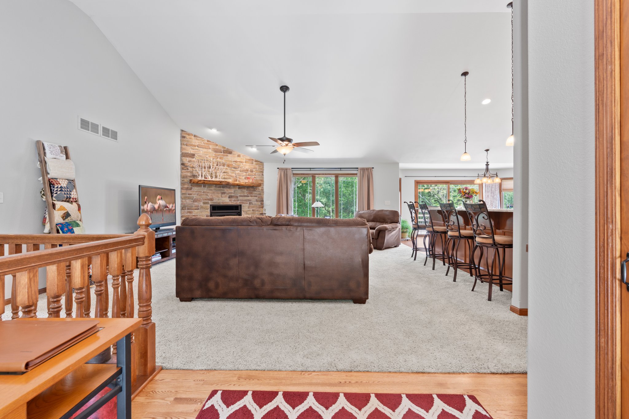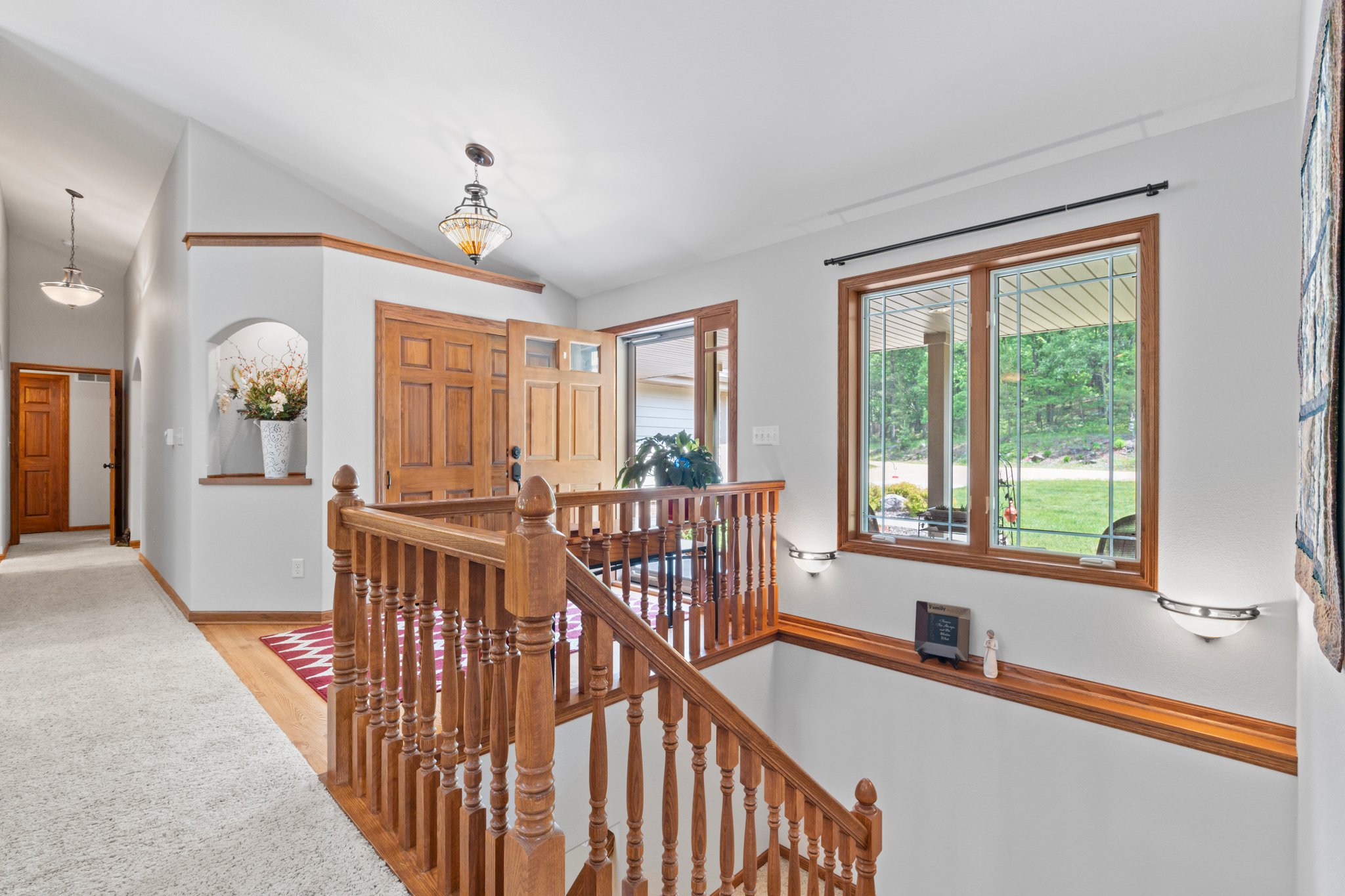 Step inside the custom-built 4-bedroom, 3.5-bath residence and you’re greeted by a wide foyer that effortlessly flows into the great room. Vaulted ceilings, hardwood floors, a wood-burning stone fireplace, and natural light from expansive windows and patio doors set a warm, inviting tone. Graceful arched doorways and rounded bullnose corners create rich architectural detail while accentuating the open flow.