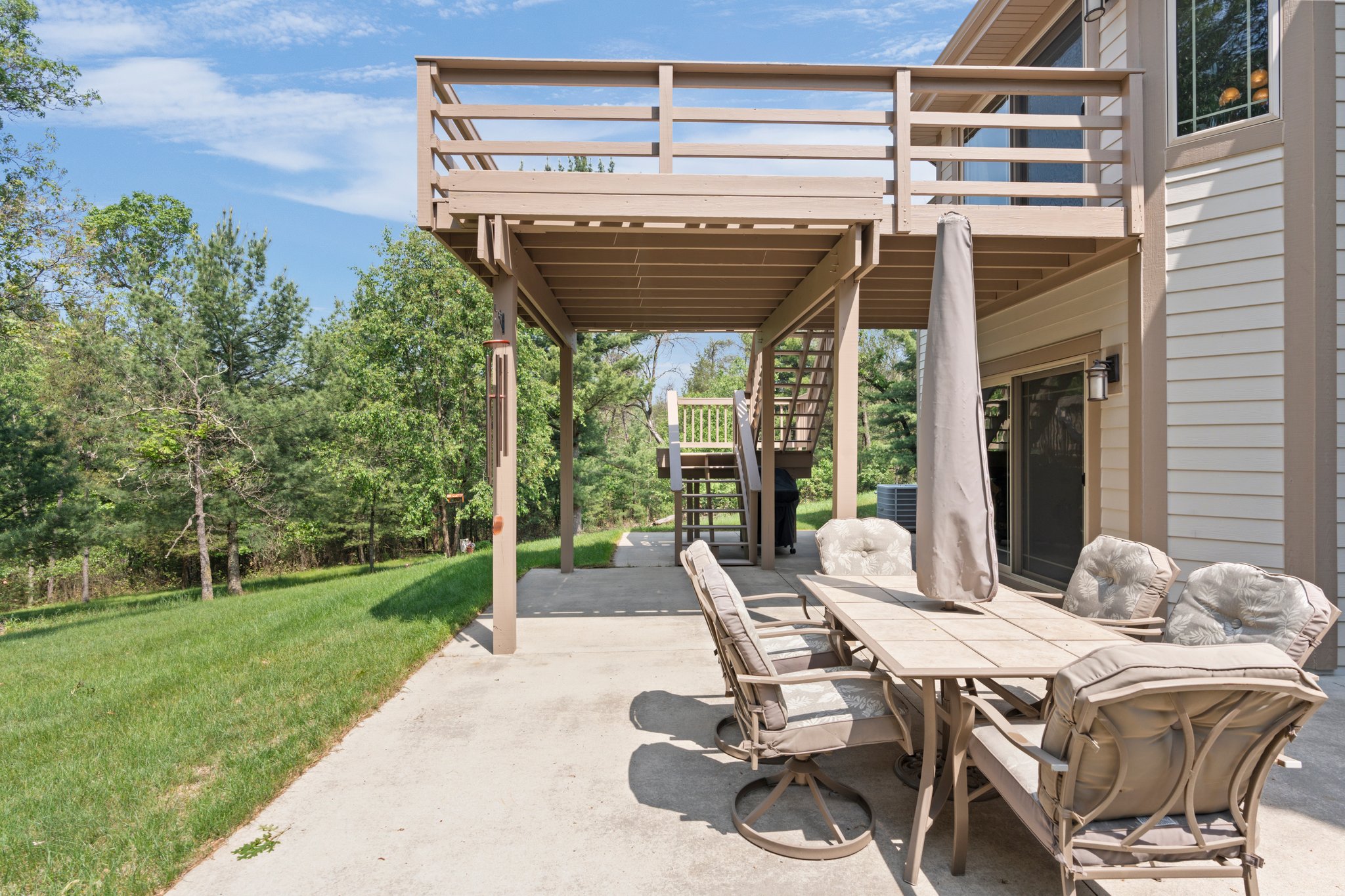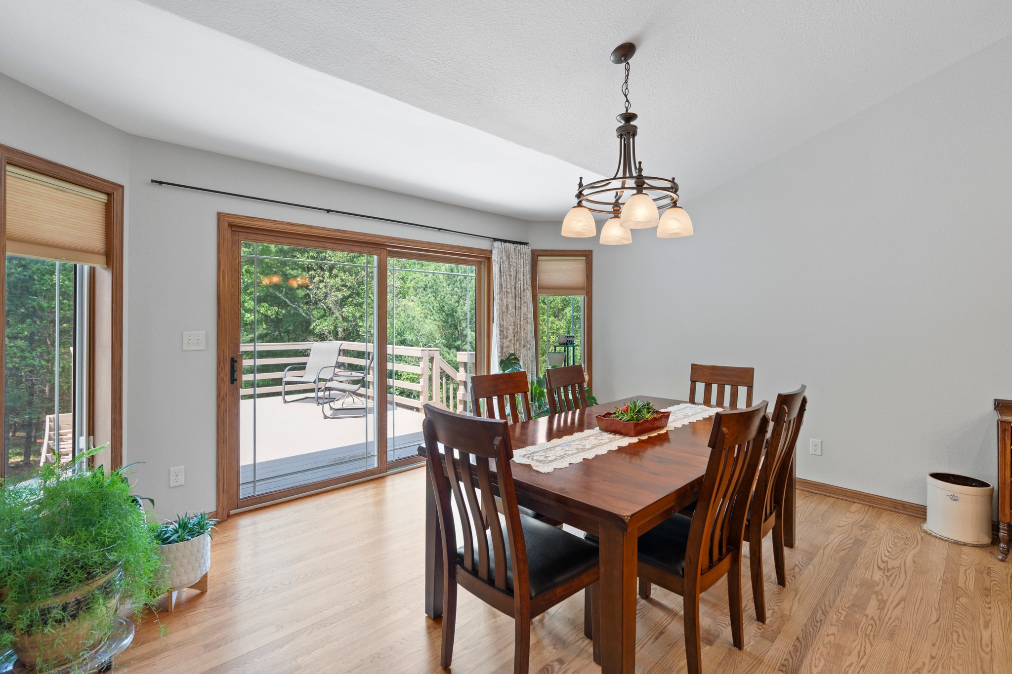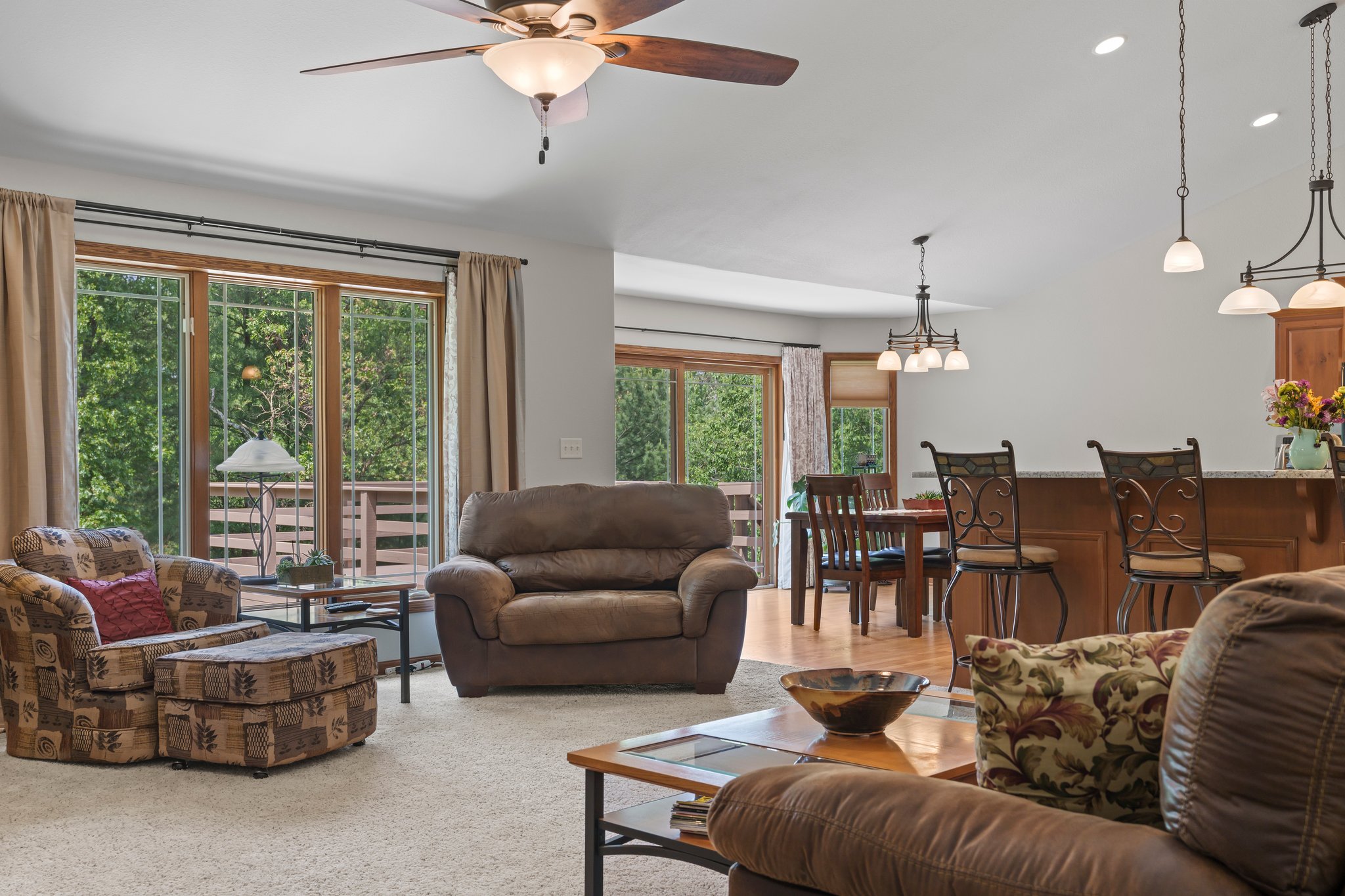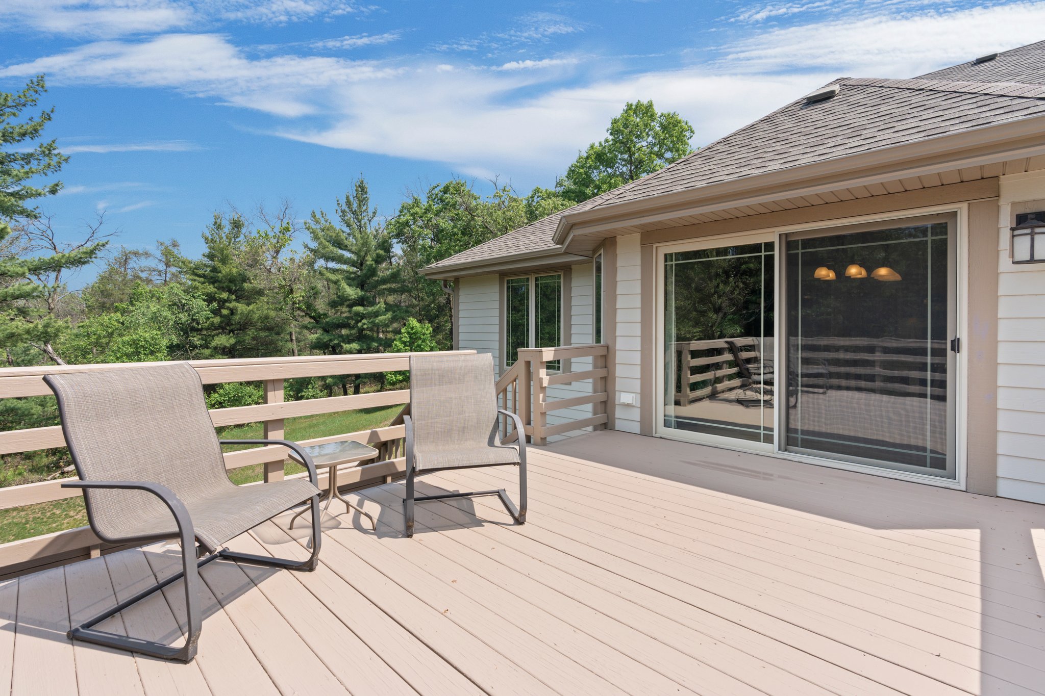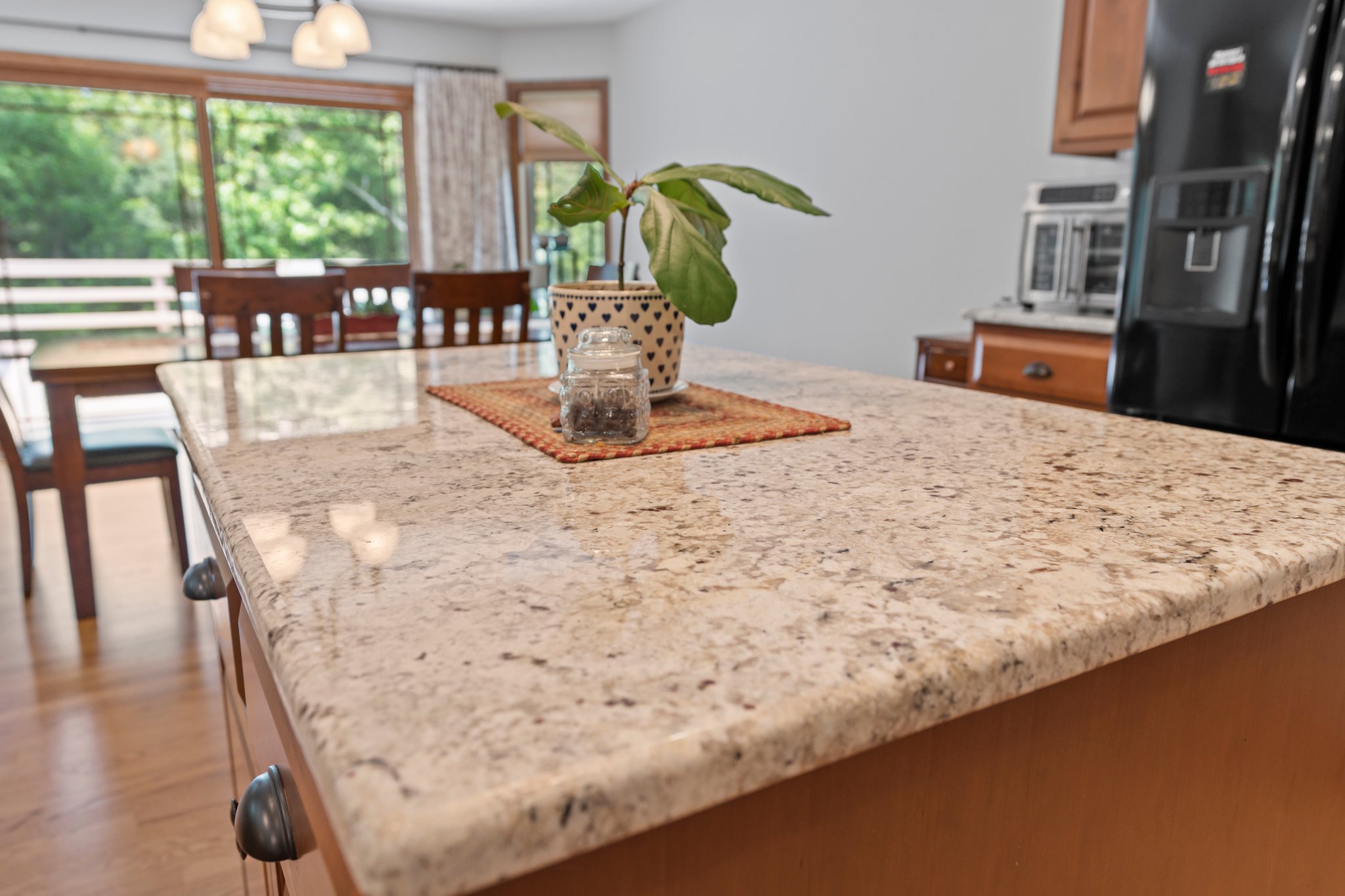 The kitchen features granite countertops, a large island with built-in storage and outlets, a walk-in pantry, breakfast bar, and under-cabinet tray lighting. Oversized patio doors open from the dining area to a spacious outdoor deck, perfectly positioned for hosting guests or enjoying peaceful evening views.