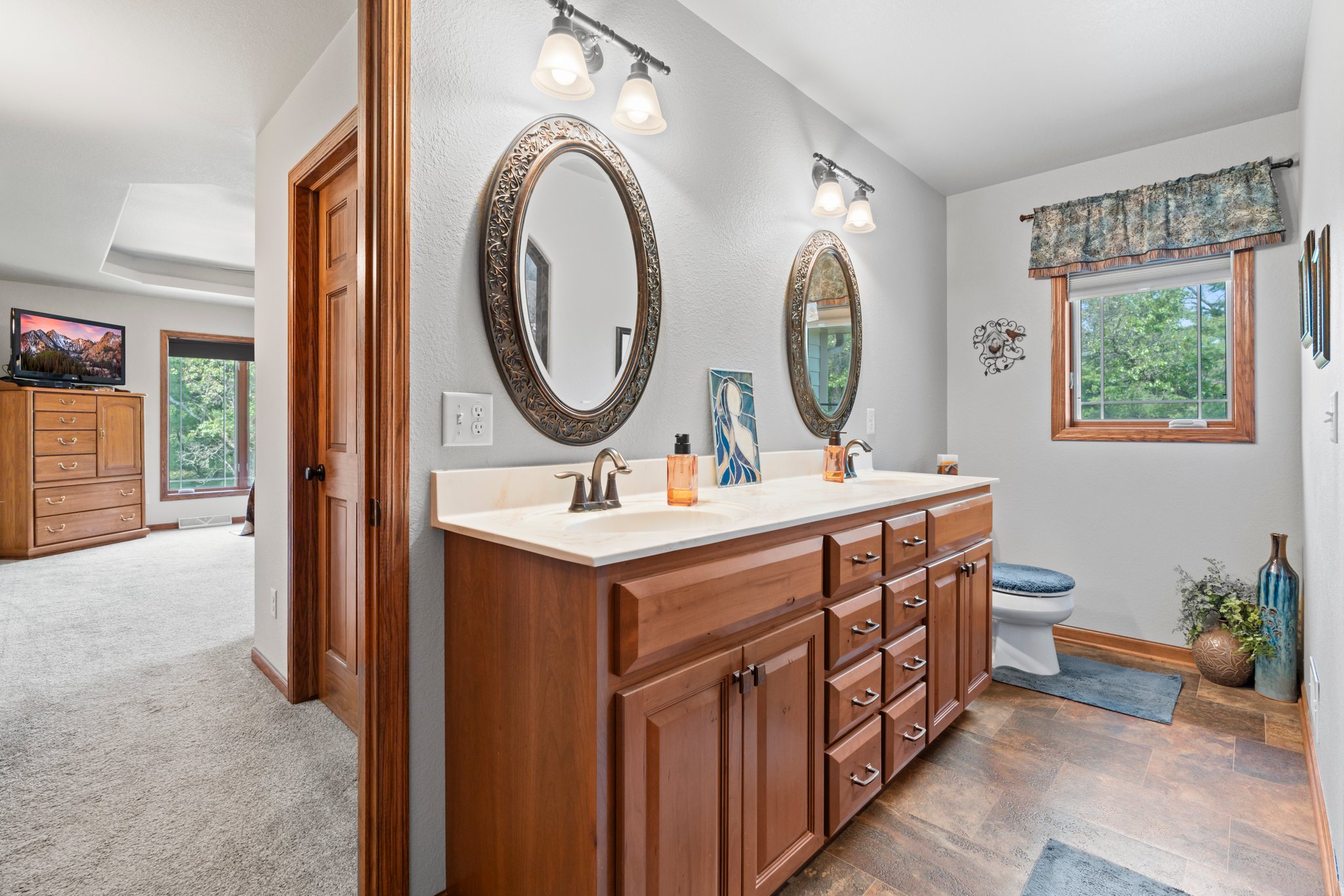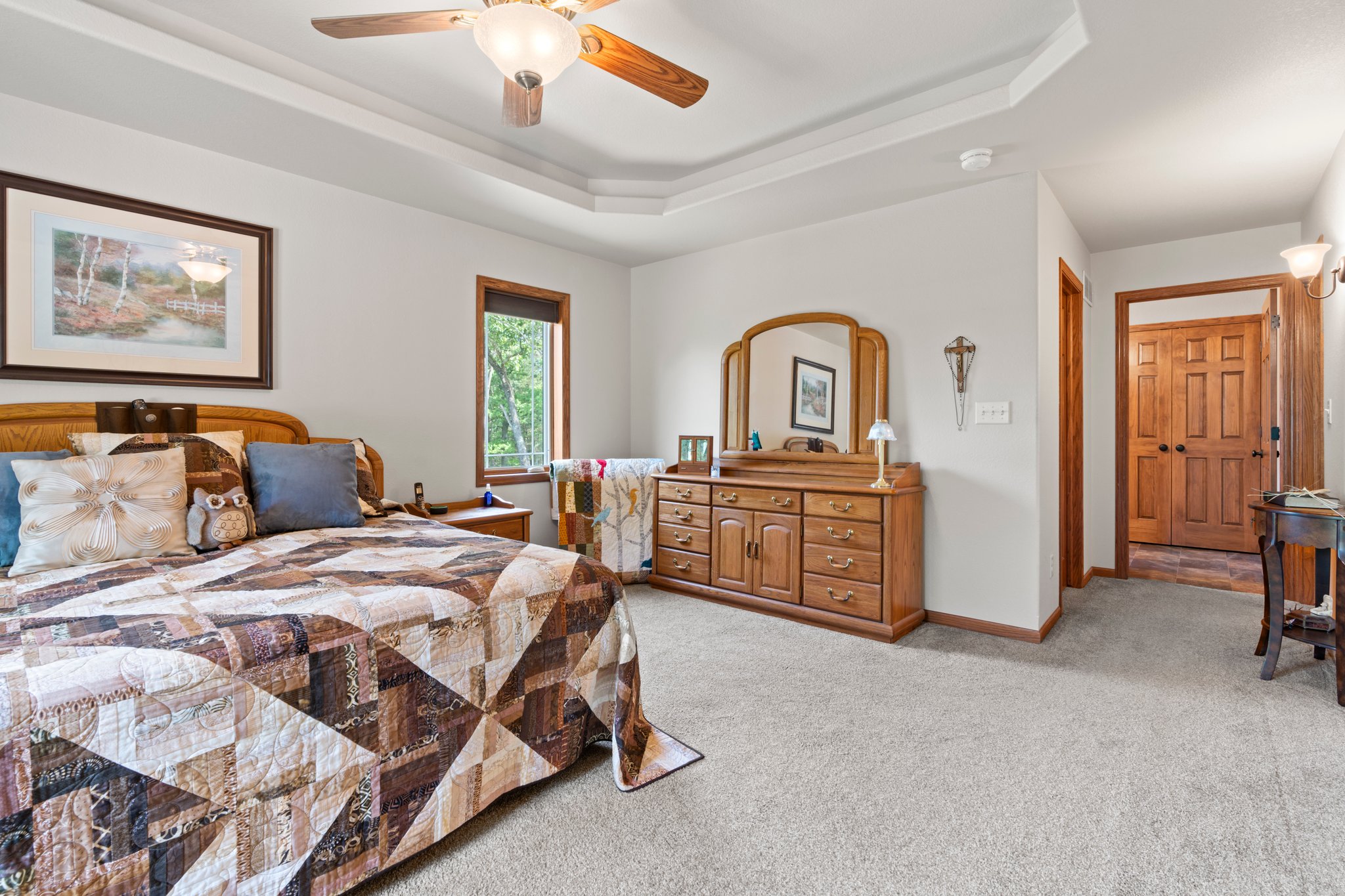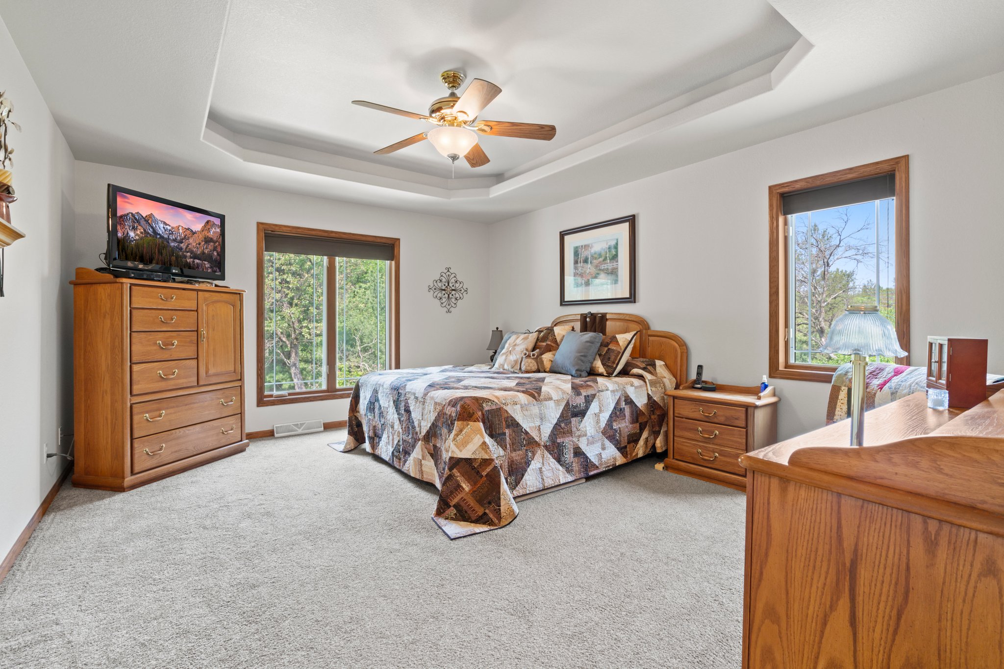 The en suite master bedroom offers a private retreat, complete with tray ceiling lighting, a walk-in closet, and a dual-sink vanity paired with an elegant walk-in shower.