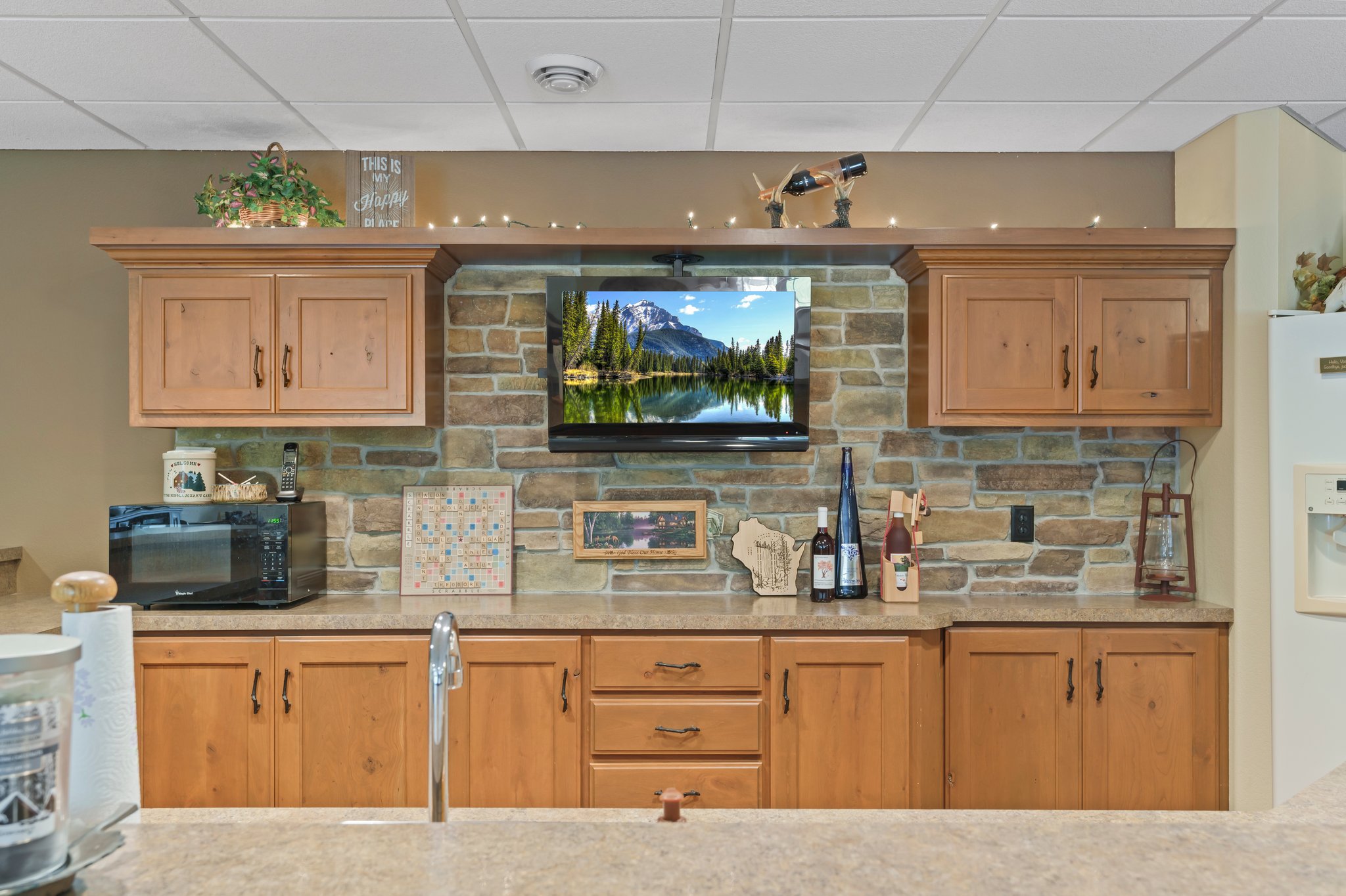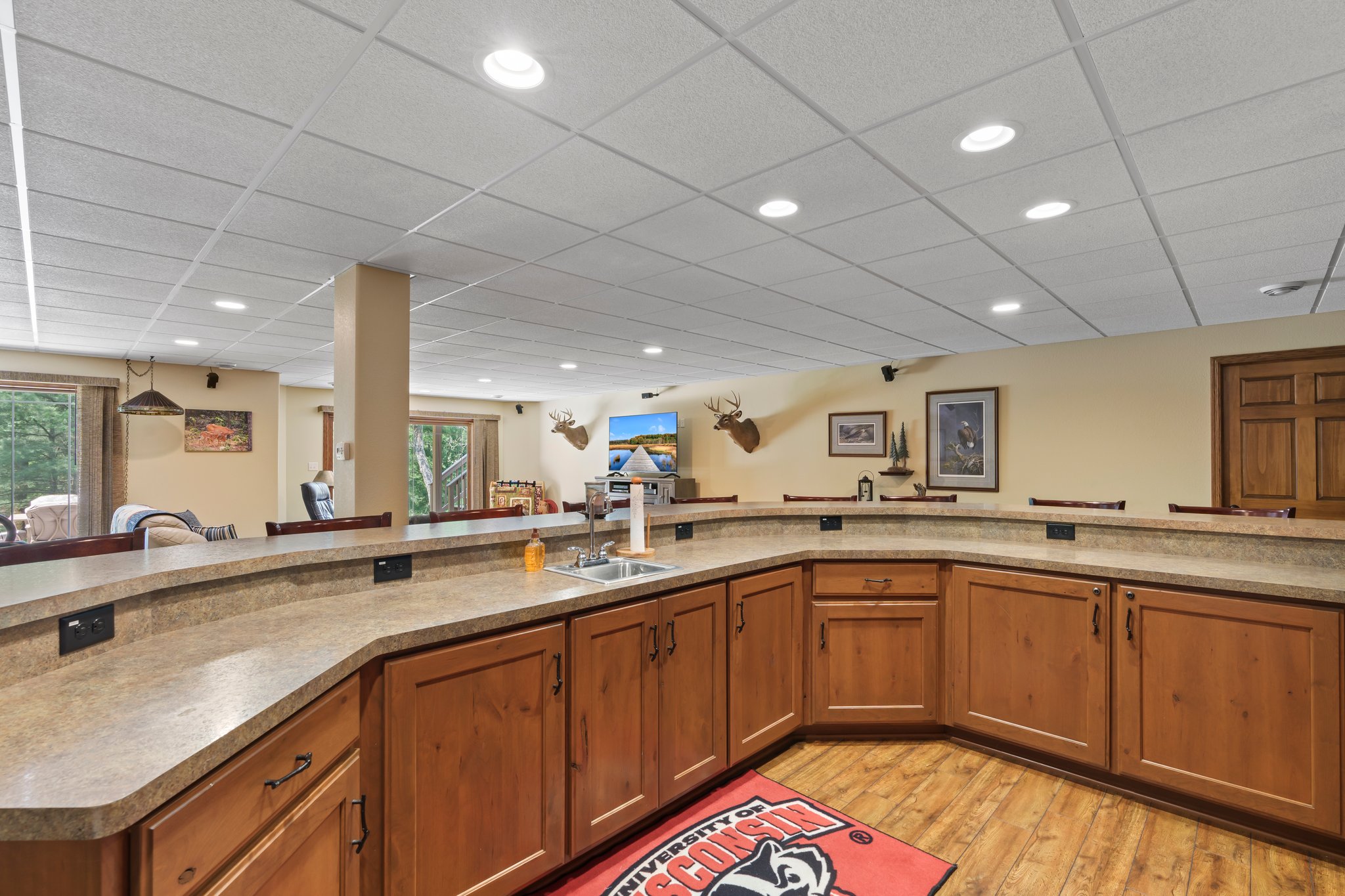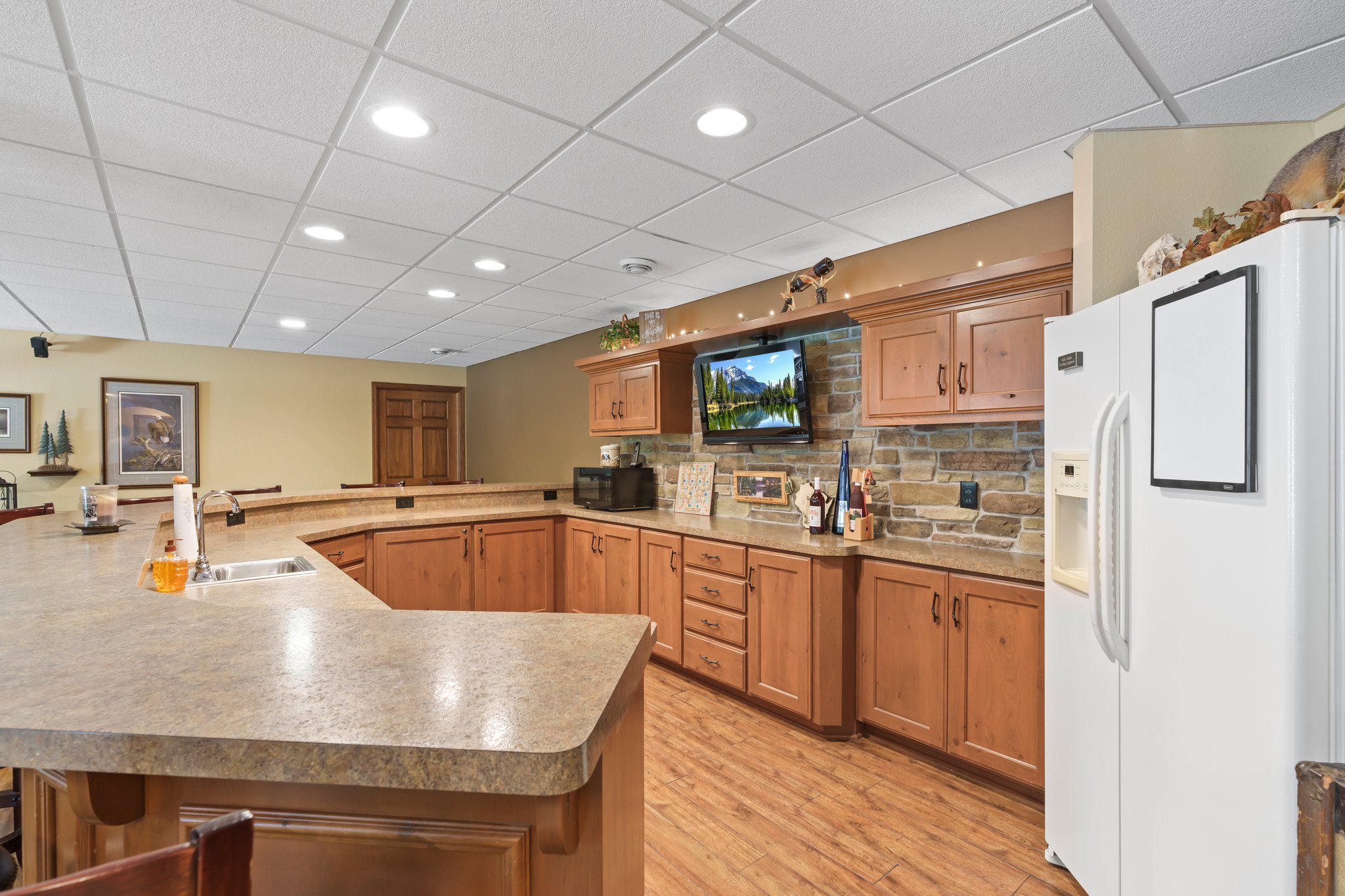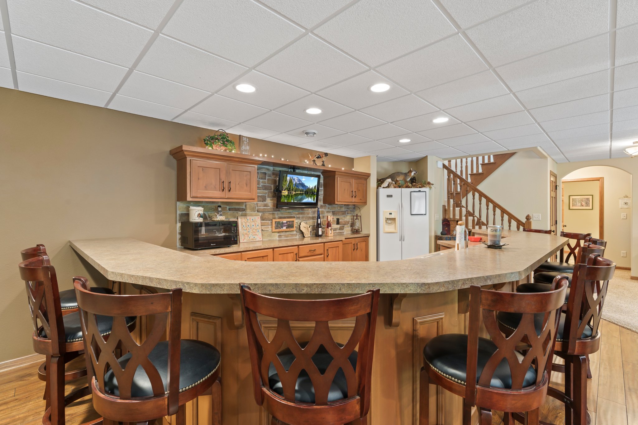 On the lower level, the home transitions into an entertainer’s haven—complete with a large family room, full bath, guest bedroom, den/office, and a custom bar accented by true brick masonry. Additional oversized patio doors provide a seamless walk-out to the concrete patio below.