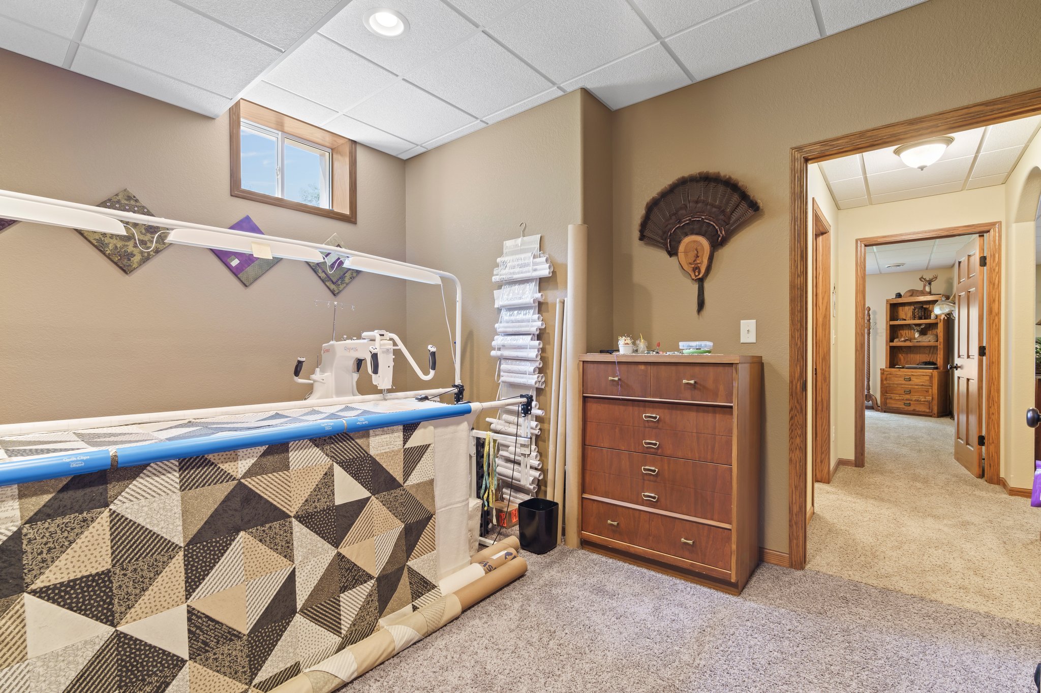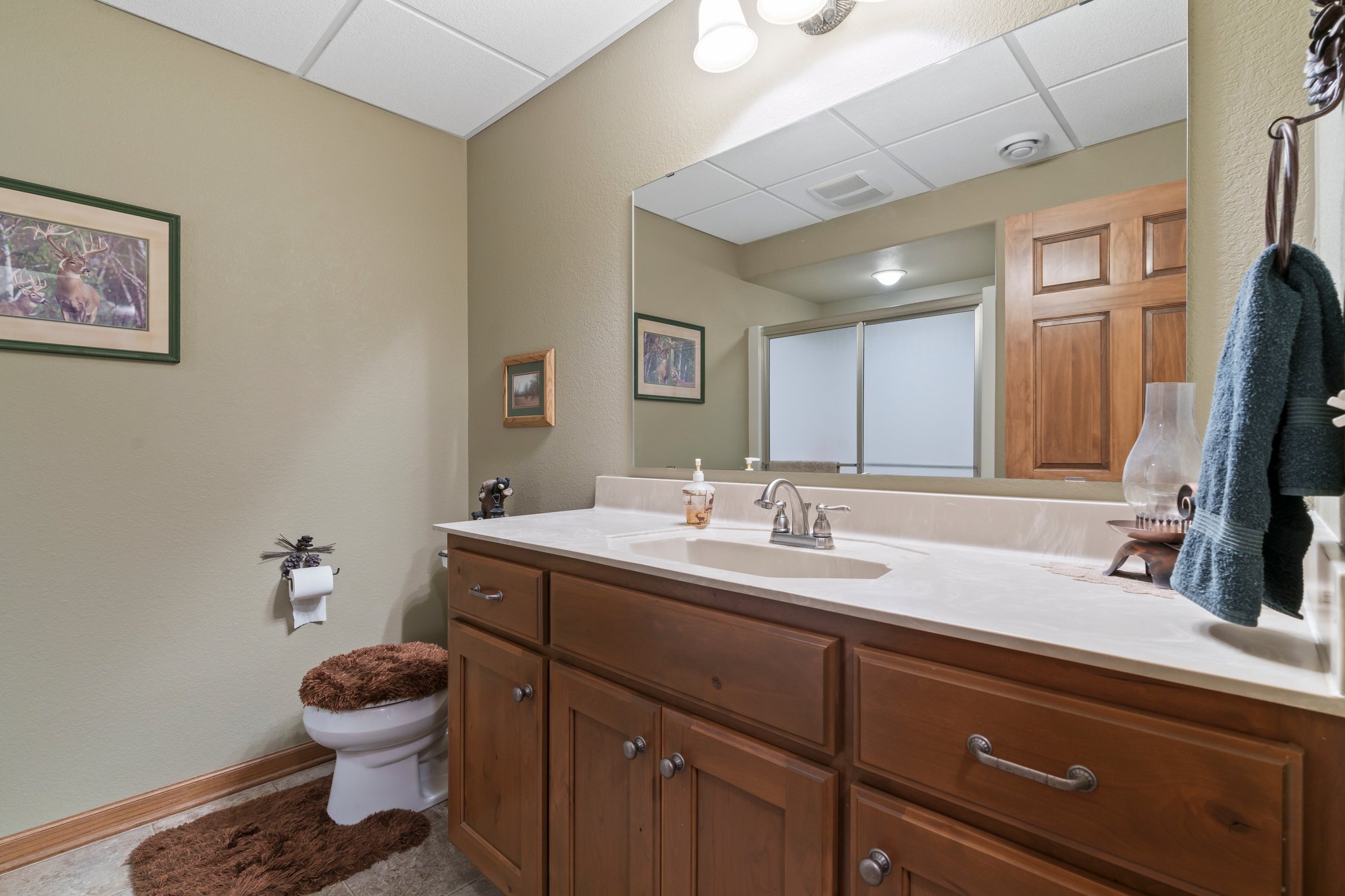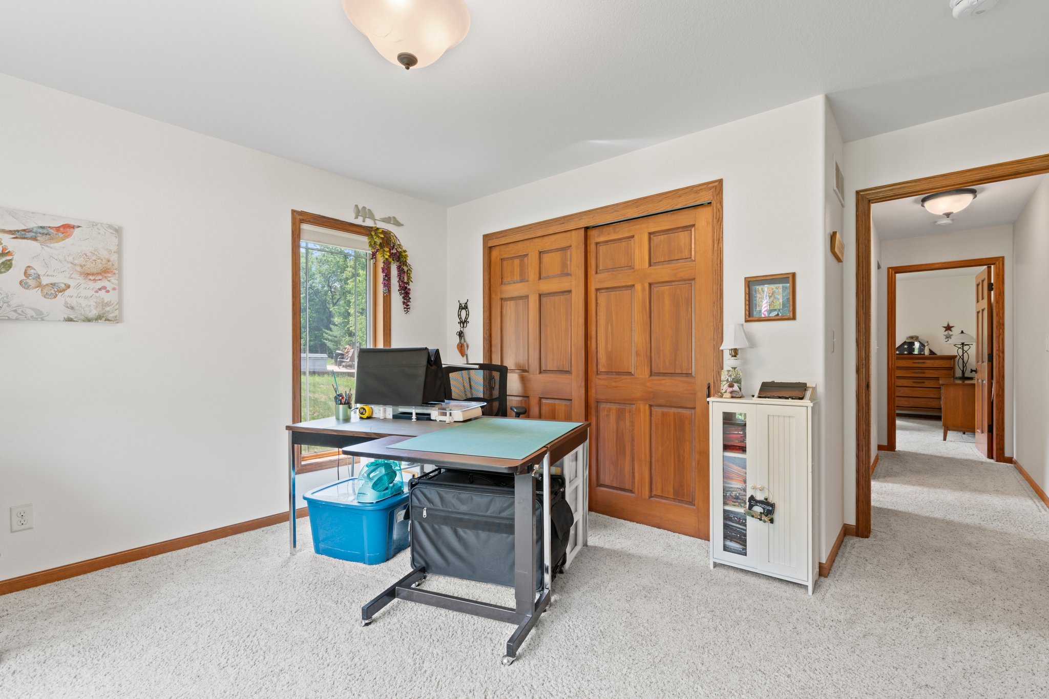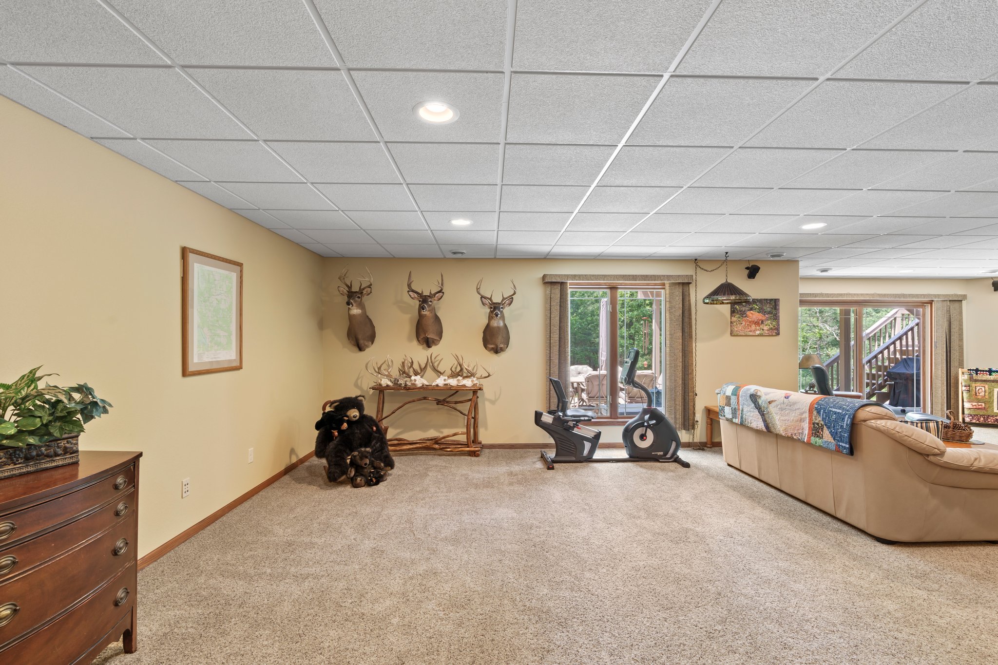 On the lower level, the home transitions into an entertainer’s haven—complete with a large family room, full bath, guest bedroom, den/office, and a custom bar accented by true brick masonry. Additional oversized patio doors provide a seamless walk-out to the concrete patio below.